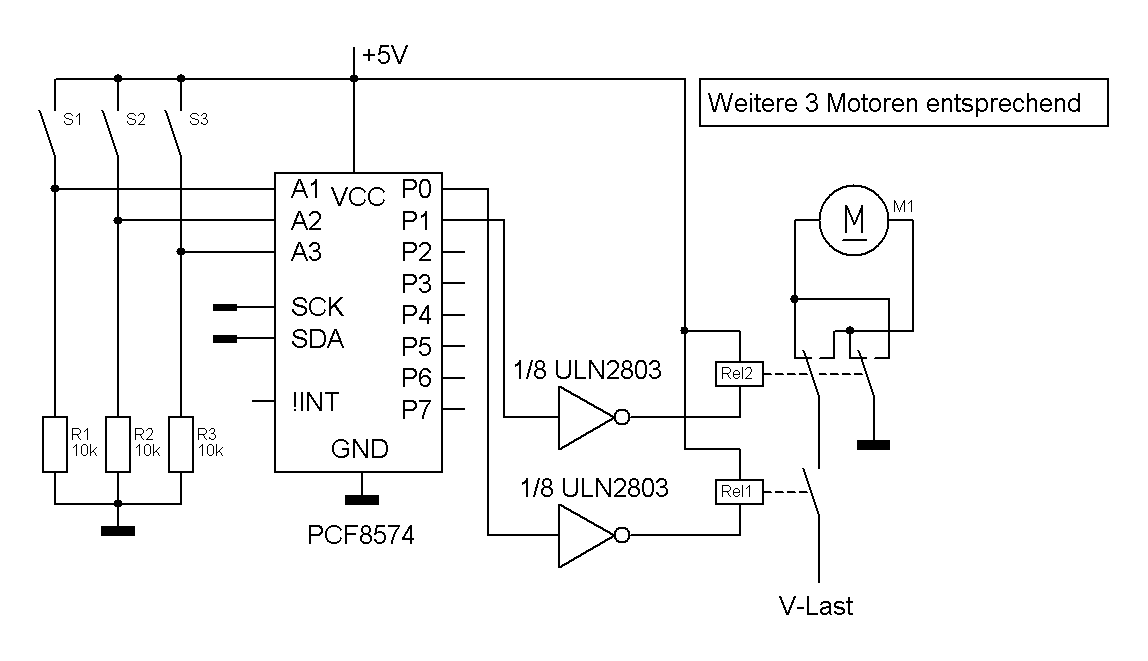 Das Modul wird über die I2C-Schnittstelle mit einem Baustein PCF8574 gesteuert. Signale werden mit einem Baustein ULN2803 verstärkt und damit die Relais geschaltet. Je zwei Bits steuern einen Motor. Das niederwertige Bit schaltet den Motor ein und das höherwertige Bit schaltet auf den Rückwärtsgang um. Hier ist der Schaltplan.